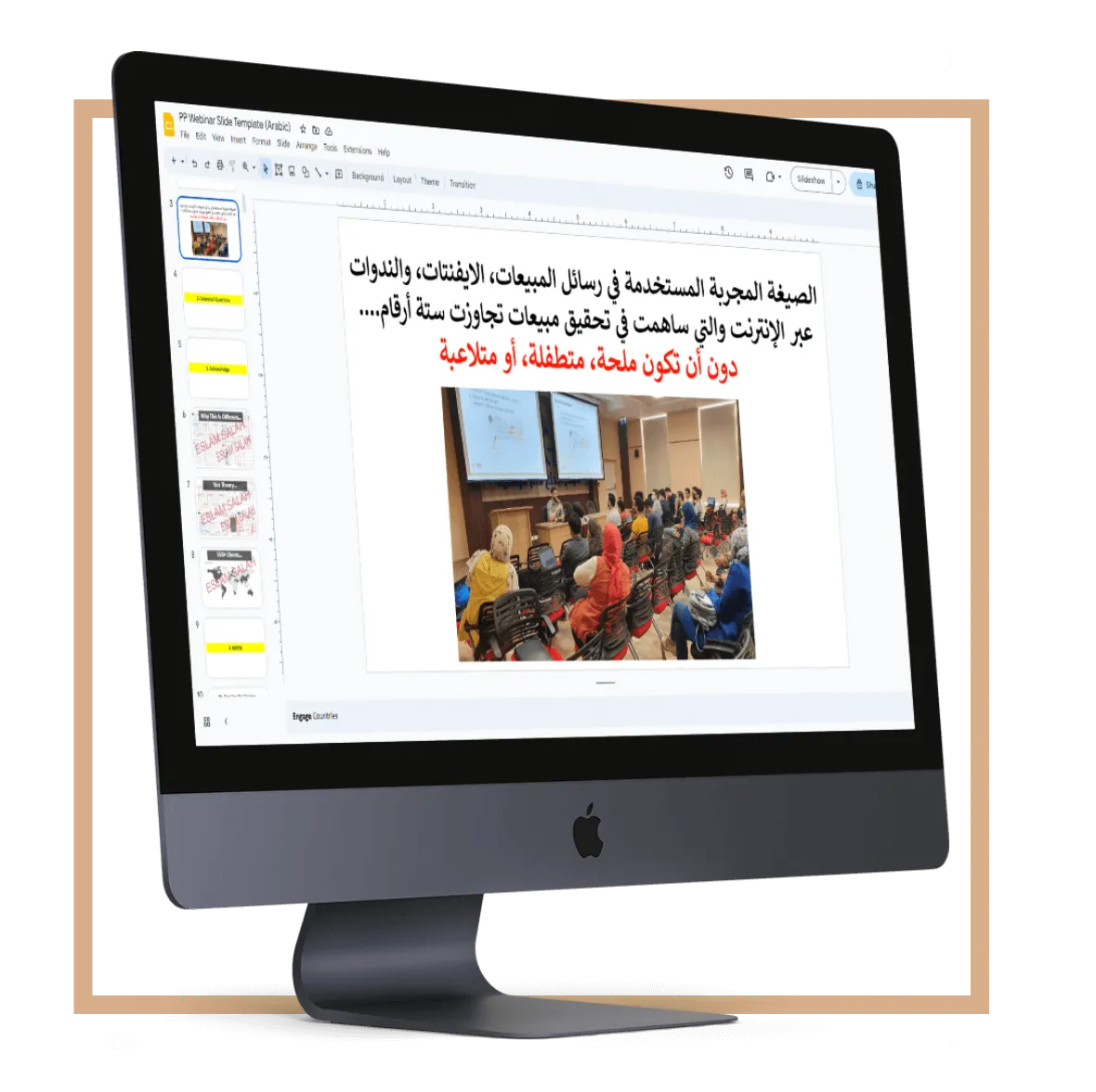ستحصل على القالب المثالى والمثبت للبرزنتيشن والذي حقق لى ولعملائى دخل أكبر من 6 أرقام. سيمكنك عرض العقبات التى واجهتك، نجاحاتك الشخصية، وقصصك وغيرها مما سيساعدك على جذب وابقاء الانتباه دون الافراط فى المشاركة أو الاطالة